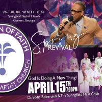 April 15, 2026, 7:00 pm The season is changing, flowers are blooming, and the grass is turning emerald green. It’s time for a fresh anointing! On Wednesday, April 15th at 7:00 PM, Pastor Eric Wendel Lee Sr., of Springfield Baptist Church in Conyers, will sow seed in the new beginning of Fountain of Faith. Recording artist Dr. Eddie Robertson and the Springfield Mass Choir will help set the “New Thing” revival praise season. We are asking each member to trust God and bring their best seed offering to help prepare for our State-of-the-Art Family Life Center Building Fund. Let’s get ready for God to bless the Fountain of Faith. |