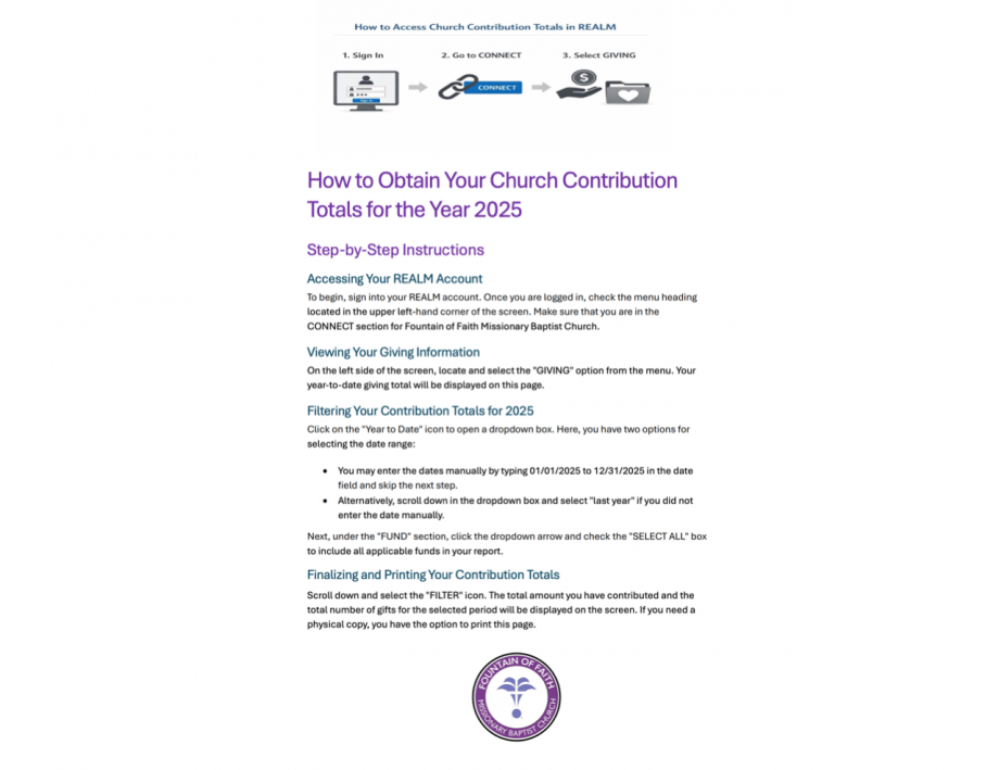How to Obtain Your Church Contribution Totals for the Year 2025 through Realm